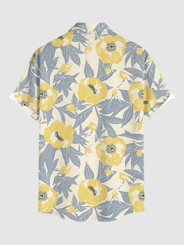 Plus Size Flowers Leaf Print Buttons Pocket Hawaii Shirt For Men - Yellow - 3xl