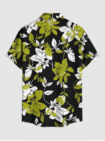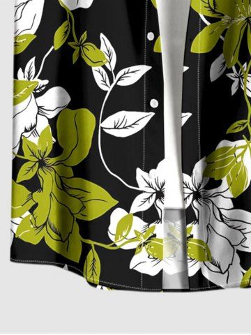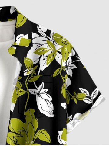 Plus Size Flowers Leaf Print Buttons Pocket Hawaii Shirt For Men - Green Yellow - L