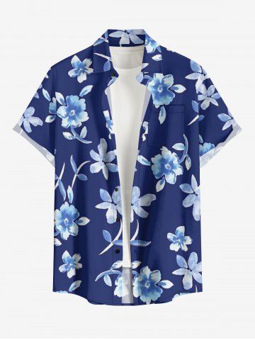 Plus Size Flowers Leaf Print Buttons Pocket Hawaii Shirt For Men - Deep Blue - 6xl