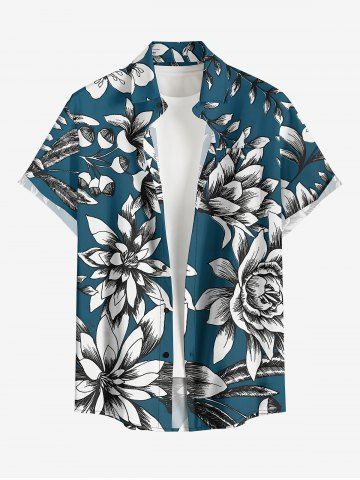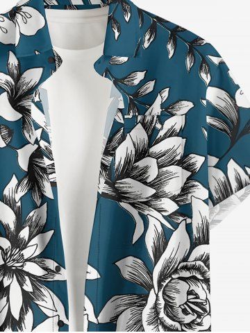 Plus Size Flowers Leaf Print Buttons Pocket Hawaii Shirt For Men - Peacock Blue - M