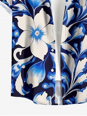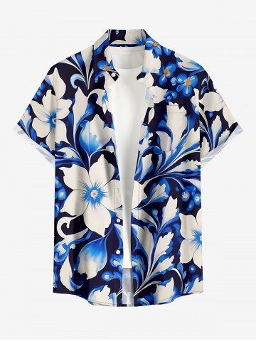 Plus Size Flowers Leaf Print Buttons Pocket Hawaii Shirt For Men - Deep Blue - M
