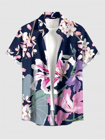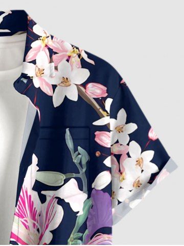 Plus Size Flowers Leaf Print Buttons Pocket Hawaii Shirt For Men - Deep Blue - 5xl