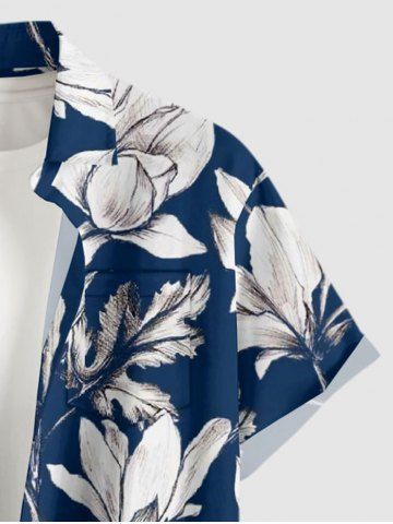 Plus Size Flowers Leaf Print Buttons Pocket Hawaii Shirt For Men - Cadetblue - 3xl