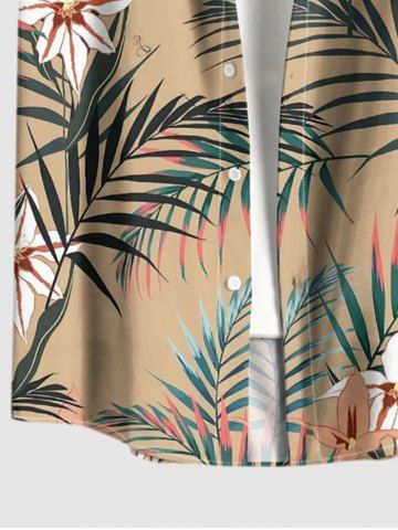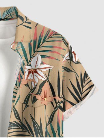 Plus Size Flowers Leaf Tropical Print Buttons Pocket Hawaii Shirt For Men - Tan - M