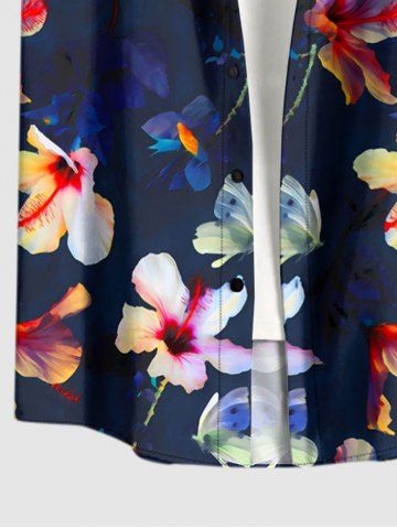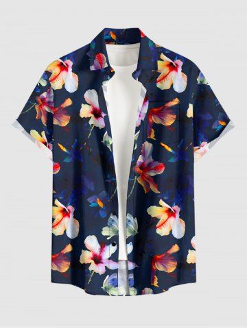 Plus Size Flowers Print Buttons Pocket Hawaii Shirt For Men - Deep Blue - S