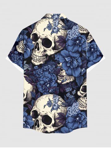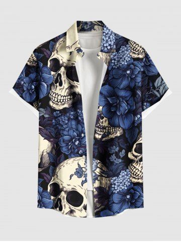 Plus Size Flowers Skulls Print Buttons Pocket Shirt For Men - Blue - L