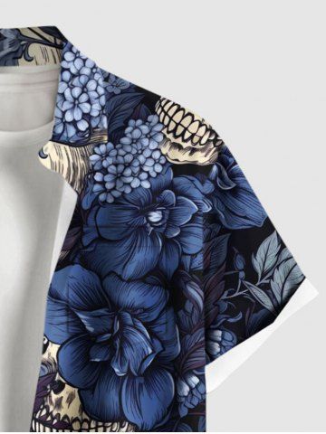 Plus Size Flowers Skulls Print Buttons Pocket Shirt For Men - Blue - 3xl