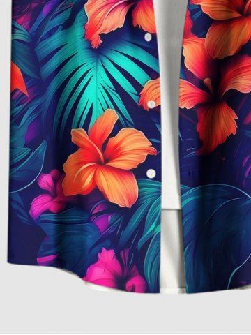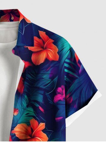 Plus Size Flowers Tropical Leaf Print Buttons Pocket Hawaii Shirt For Men - Navy Blue - 2xl
