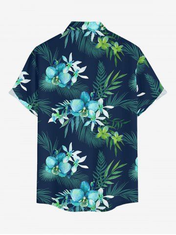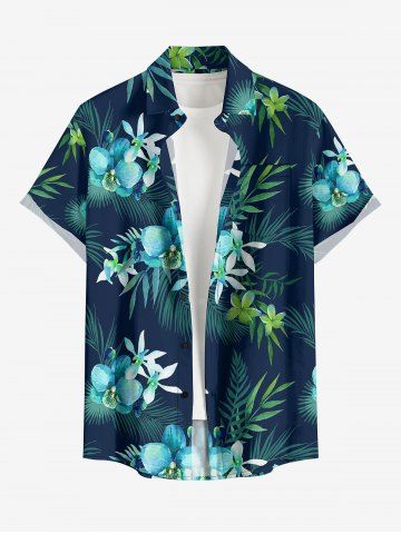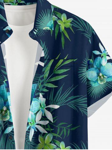 Plus Size Flowers Tropical Leaf Print Buttons Pocket Hawaii Shirt For Men - Deep Blue - Xl