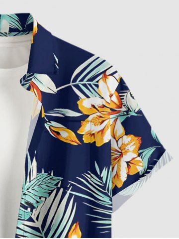 Plus Size Flowers Tropical Leaf Print Buttons Pocket Hawaii Shirt For Men - Deep Blue - S