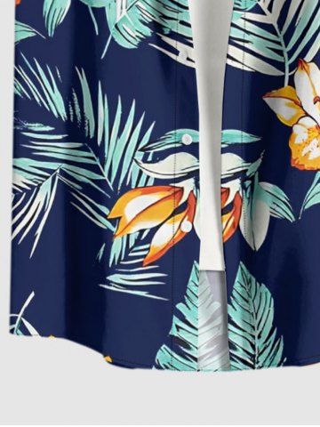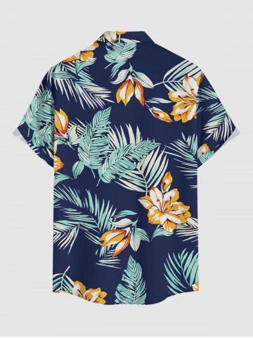 Plus Size Flowers Tropical Leaf Print Buttons Pocket Hawaii Shirt For Men - Deep Blue - 3xl