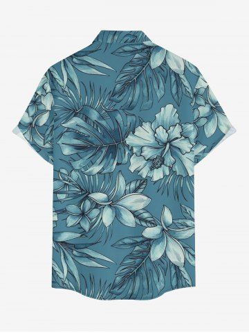 Plus Size Flowers Tropical Leaf Print Buttons Pocket Hawaii Shirt For Men - Peacock Blue - S