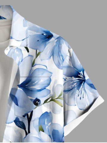 Plus Size Flowers Watercolor Print Buttons Pocket Hawaii Shirt For Men - White - 3xl