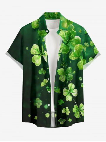 Short Sleeves Shirts > Plus Size Four Leaf Clover Print St. Patrick's Day Button Pocket Shirt For Men