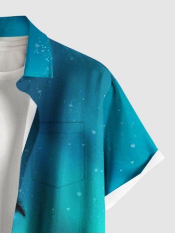 Plus Size Galaxy Ombre Coconut Tree Hibiscus Flowers Leaf Print Buttons Pocket Hawaii Shirt For Men - Dark Turquoise - Xl