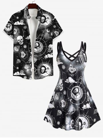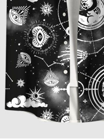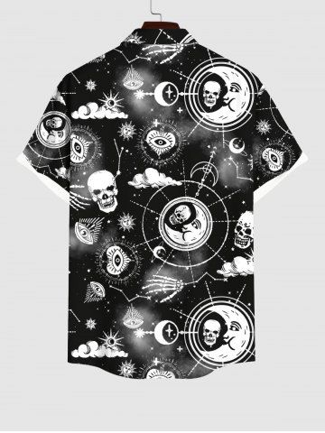 Plus Size Galaxy Sun Moon Star Eyes Skulls Print Buttons Pocket Shirt For Men - Black - S