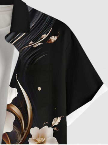 Plus Size Gilding Leaf Flower Curve Print Hawaii Button Pocket Shirt For Men - Black - 4xl