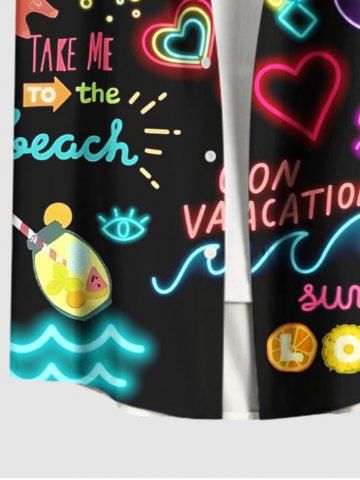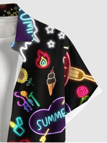 Plus Size Glitter Colorful Neon Heart Juice Letter Ice Cream Print Hawaii Button Pocket Shirt For Men - Black - 6xl