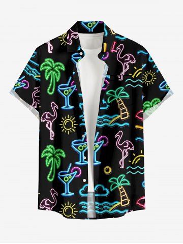 Plus Size Glitter Neon Coconut Tree Flamingo Juice Print Hawaii Button Pocket Shirt For Men - Black - 2xl