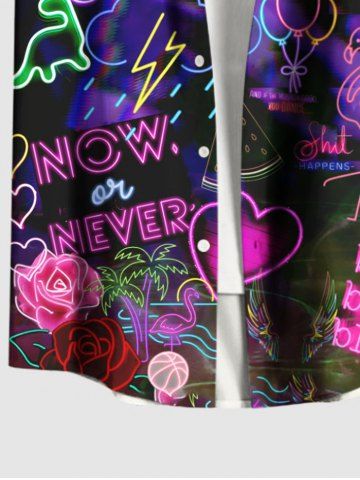 Plus Size Glitter Neon Ombre Heart Rose Flower Dog Balloon Flamingo Dinosaur Print Hawaii Button Pocket Shirt For Men - Black - Xl