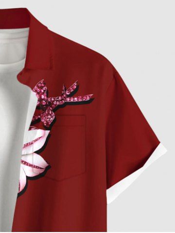 Plus Size Glitter Sequins Floral Leaf Print Hawaii Button Pocket Shirt For Men - Red - 4xl