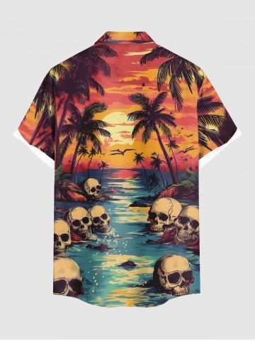 Short Sleeves Shirts > Plus Size Halloween Costume Coconut Tree Skulls Sun Seascape Print Buttons Pocket Hawaii Shirt For Men