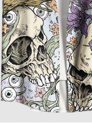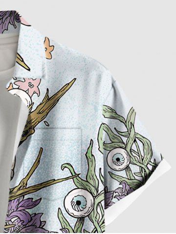 Plus Size Halloween Skull Flowers Eyes Print Buttons Pocket Shirt For Men - Powder Blue - Xl