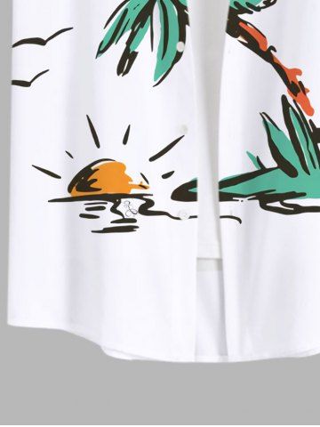 Plus Size Hand Painting Coconut Tree Sun Swallow Print Hawaii Button Pocket Shirt For Men - White - S