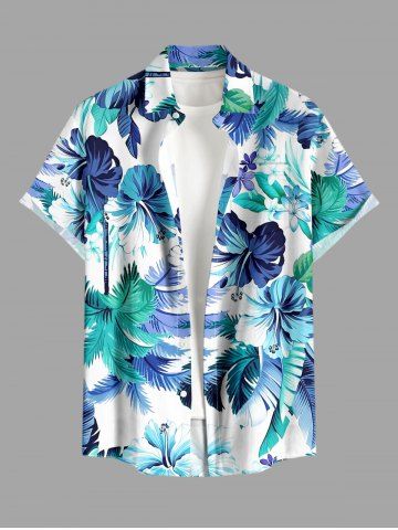 Plus Size Hibiscus Flower Coconut Tree Print Buttons Pocket Hawaii Shirt For Men - Cadetblue - 3xl