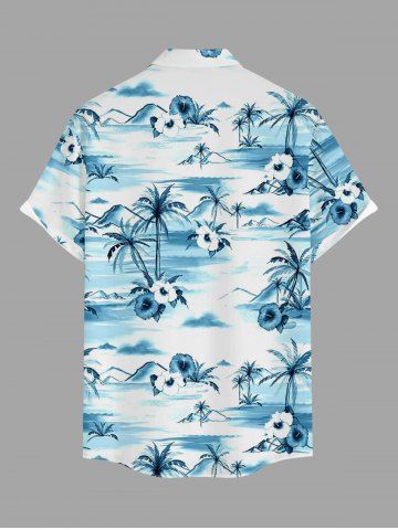 Plus Size Hibiscus Flower Coconut Tree Print Buttons Pocket Hawaii Shirt For Men - Light Blue - 3xl