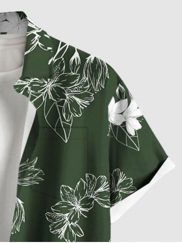 Plus Size Hibiscus Flower Leaf Branch Print Hawaii Button Pocket Shirt For Men - Green - L