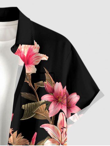 Plus Size Hibiscus Flower Leaf Print Buttons Pocket Hawaii Shirt For Men - Black - M