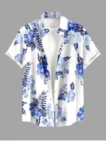 Plus Size Hibiscus Flower Leaf Print Buttons Pocket Hawaii Shirt For Men - White - M