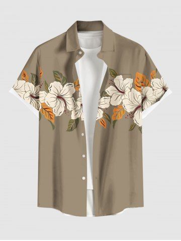 Plus Size Hibiscus Flower Leaf Print Buttons Pocket Hawaii Shirt For Men - Tan - 4xl