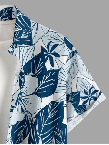 Plus Size Hibiscus Flower Leaf Print Buttons Pocket Hawaii Shirt For Men - Peacock Blue - L