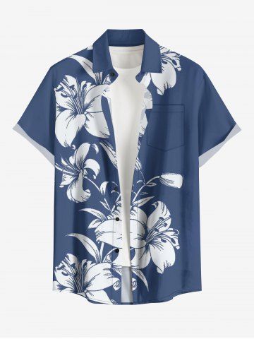 Plus Size Hibiscus Flower Leaf Print Buttons Pocket Hawaii Shirt For Men - Blue - S