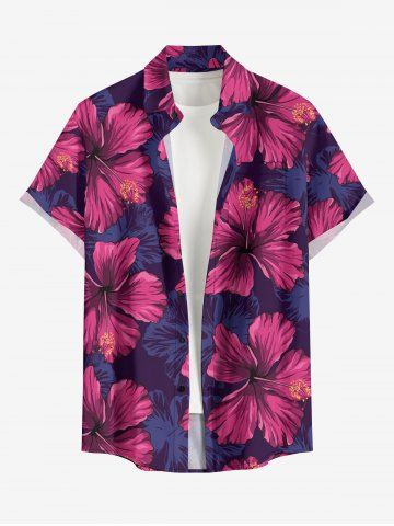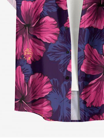 Plus Size Hibiscus Flower Leaf Print Buttons Pocket Hawaii Shirt For Men - Purplish Red - 4xl