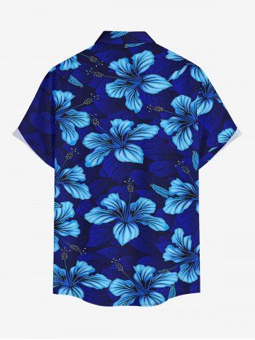 Plus Size Hibiscus Flower Leaf Print Buttons Pocket Hawaii Shirt For Men - Blue - 4xl