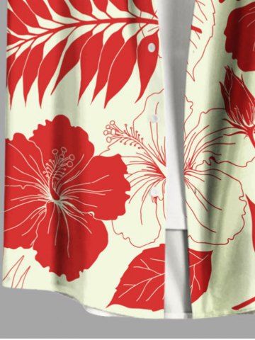 Plus Size Hibiscus Flower Leaf Tropical Print Buttons Pocket Hawaii Shirt For Men - Red - S