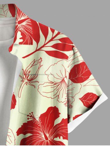 Plus Size Hibiscus Flower Leaf Tropical Print Buttons Pocket Hawaii Shirt For Men - Red - 3xl