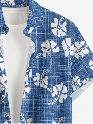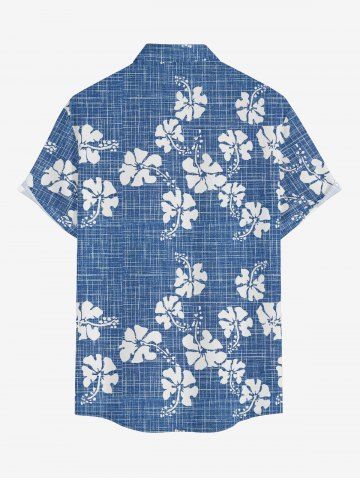 Plus Size Hibiscus Flower Plaid Print Buttons Pocket Hawaii Shirt For Men - Denim Blue - 3xl