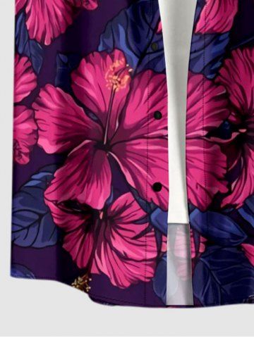 Plus Size Hibiscus Flower Print Buttons Pocket Hawaii Shirt For Men - Rose Red - Xl