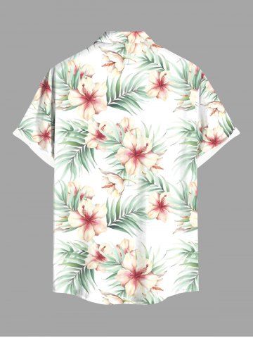 Plus Size Hibiscus Flower Tropial Leaf Print Buttons Pocket Hawaii Shirt For Men - White - L