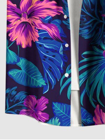 Plus Size Hibiscus Flower Tropical Leaf Print Buttons Pocket Hawaii Shirt For Men - Purple - 3xl