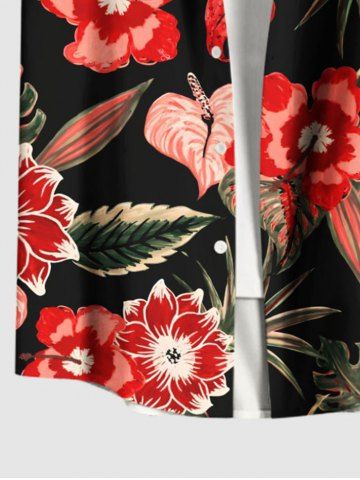 Plus Size Hibiscus Flower Tropical Leaf Print Buttons Pocket Hawaii Shirt For Men - Red - 2xl