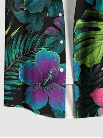 Plus Size Hibiscus Flower Tropical Leaf Print Buttons Pocket Hawaii Shirt For Men - Green - L