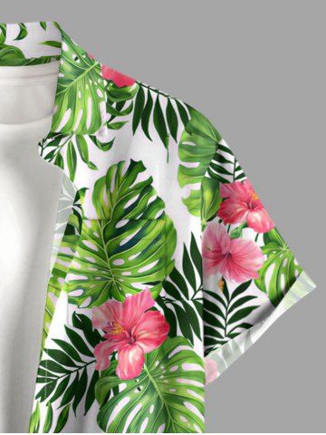 Plus Size Hibiscus Flower Tropical Leaf Print Buttons Pocket Hawaii Shirt For Men - Green - 2xl