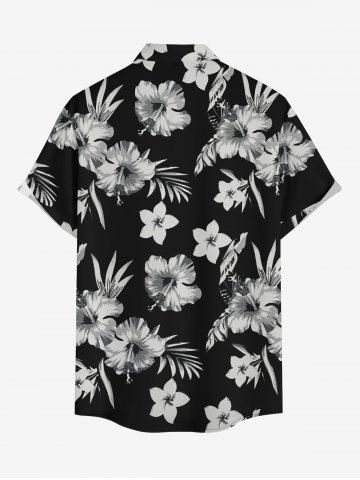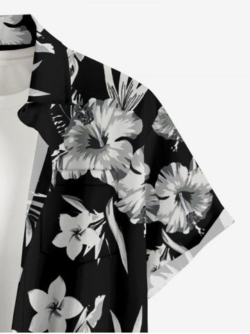 Plus Size Hibiscus Flower Tropical Leaf Print Buttons Pocket Hawaii Shirt For Men - Black - S