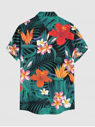 Plus Size Hibiscus Flower Tropical Leaf Print Buttons Pocket Hawaii Shirt For Men - Deep Green - M