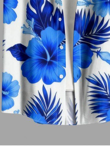 Plus Size Hibiscus Flower Tropical Leaf Print Buttons Pocket Hawaii Shirt For Men - Sky Blue - 3xl